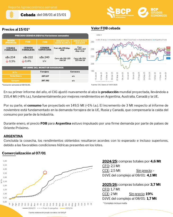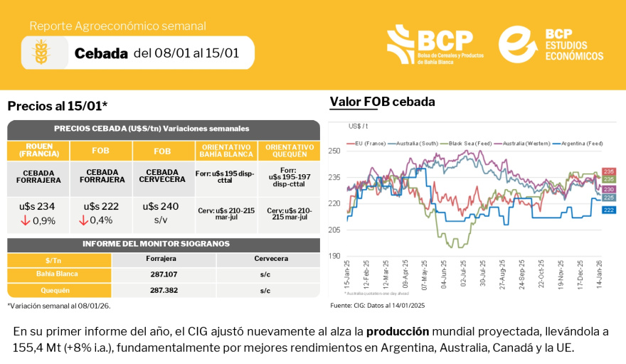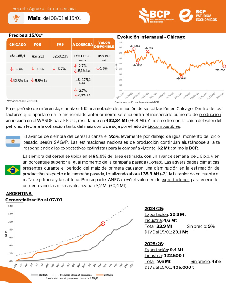 Reporte agroeconómico semanal de maíz, soja, trigo y cebada.